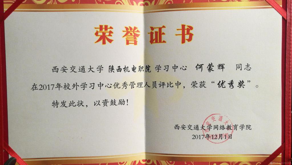 2017年12月10日,在湖南長沙舉行的2017年西安交通大學現(xiàn)代遠程教育校外學習中心工作會議上,我院西安交大遠程教育校外學習中心被西安交通大學評為“優(yōu)秀示范學習中心”。這是繼2016年被全國高等學校現(xiàn)代遠程教育協(xié)作組、《中國遠程教育》雜志社評為“全國高?,F(xiàn)代遠程教育優(yōu)秀校外學習中心”之后再次獲得又一殊榮。同時,我院繼續(xù)教育中心何蒙輝主任也連續(xù)兩年被評為管理人員“優(yōu)秀獎”。