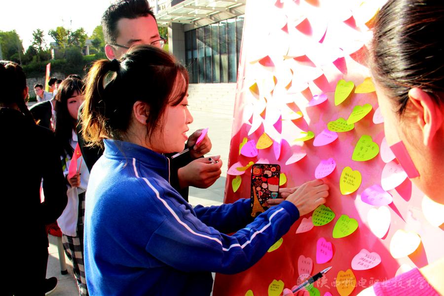 9月28日下午在汽車機(jī)電大樓門(mén)前廣場(chǎng),老師、同學(xué)們紛紛提筆,在標(biāo)語(yǔ)上簽下自己的姓名,以此來(lái)表達(dá)對(duì)祖國(guó)的關(guān)心與祝福。在彩色心形便簽上寫(xiě)下祝福的話語(yǔ)并與國(guó)旗合影,同學(xué)們通過(guò)各種形式的照片來(lái)表達(dá)對(duì)祖國(guó)母親的祝福。