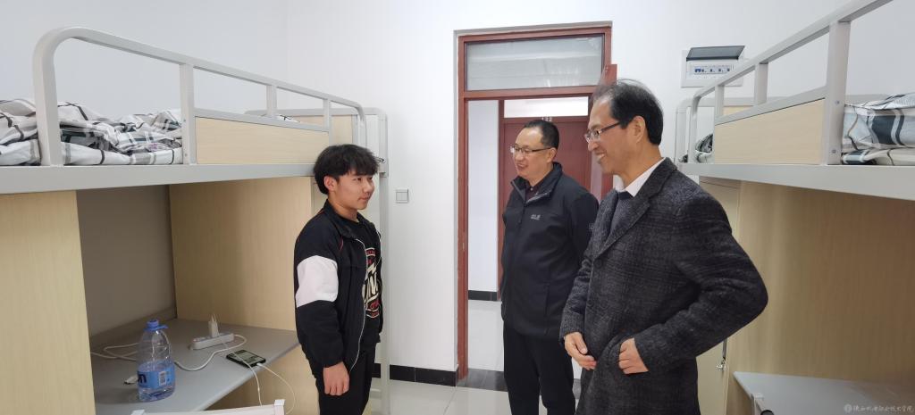 黨委書(shū)記伊遜智(右)、院長(zhǎng)向紀(jì)明(中)深入學(xué)生公寓與已報(bào)到學(xué)生交談