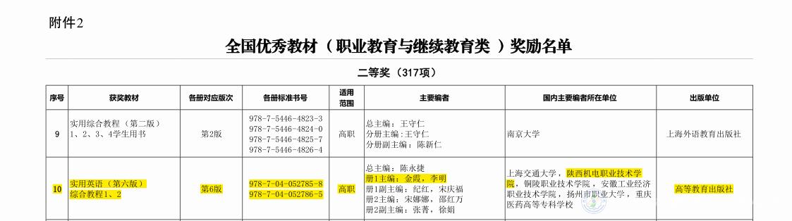 我校名師工作室主持人、基礎(chǔ)部李明副教授主編的《實(shí)用英語(yǔ)綜合教程(第六版)》榮獲全國(guó)優(yōu)秀教材(職業(yè)教育與繼續(xù)教育類)二等獎(jiǎng)。這是我校在教材建設(shè)成果上取得的新突破。