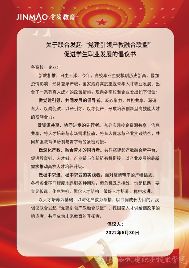 為響應(yīng)黨和國(guó)家大力促進(jìn)產(chǎn)教融合、協(xié)同育人的要求,大會(huì)最后,學(xué)校與6個(gè)中國(guó)金茂經(jīng)營(yíng)單位、其他26個(gè)高校代表共同向全社會(huì)發(fā)出行動(dòng)倡議,號(hào)召各校企攜手,聯(lián)合發(fā)起“黨建引領(lǐng)產(chǎn)教融合聯(lián)盟”,做國(guó)家人才供給側(cè)改革的響應(yīng)者,共同成為未來(lái)教育的開(kāi)拓者。