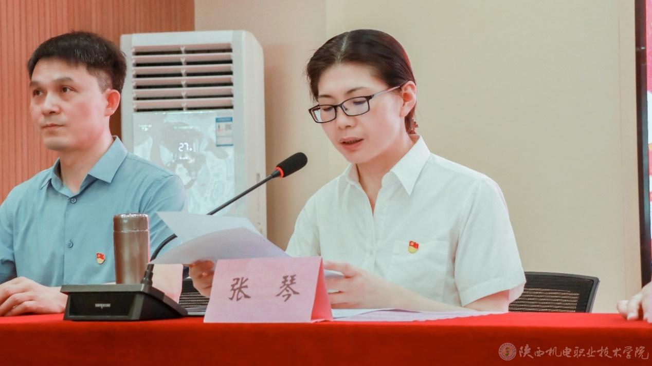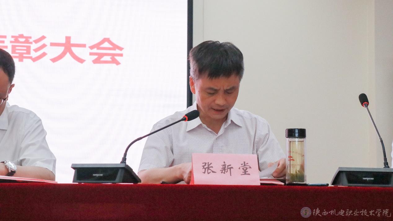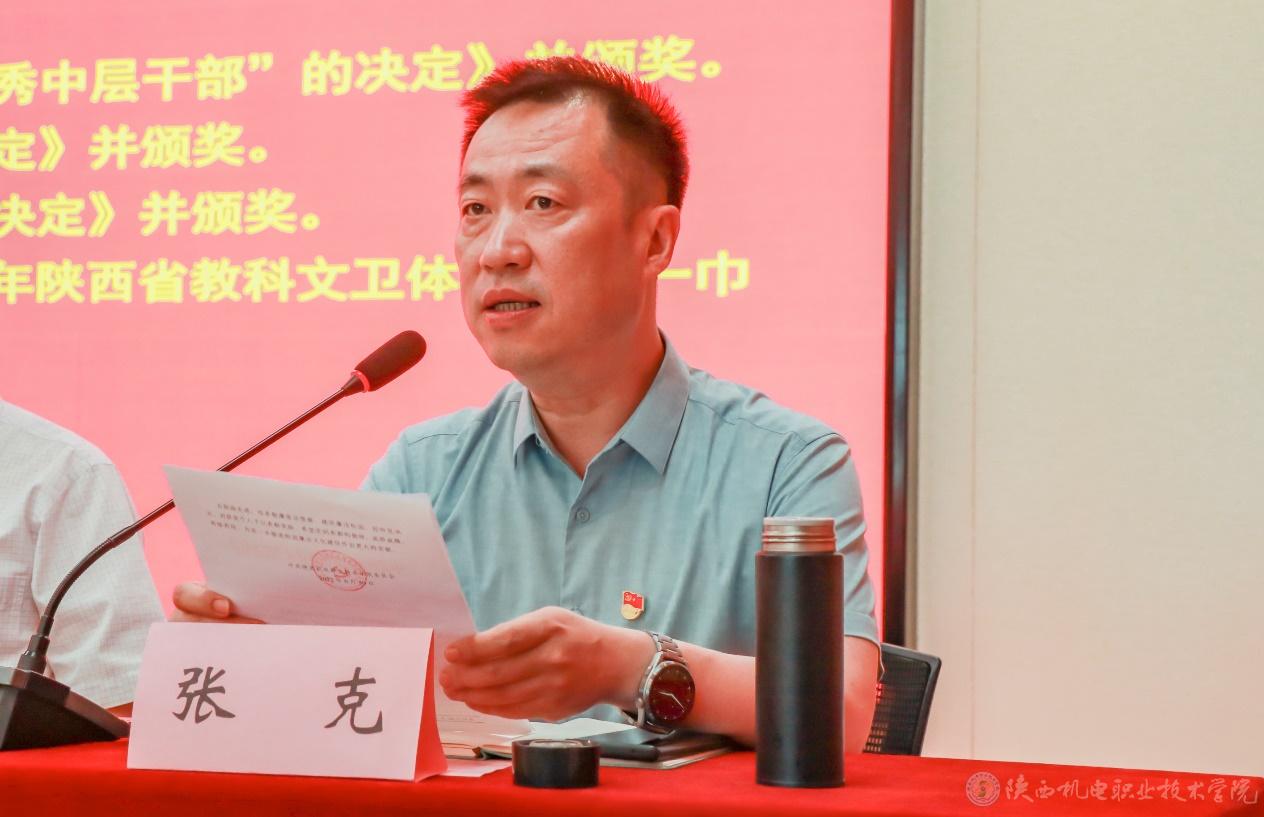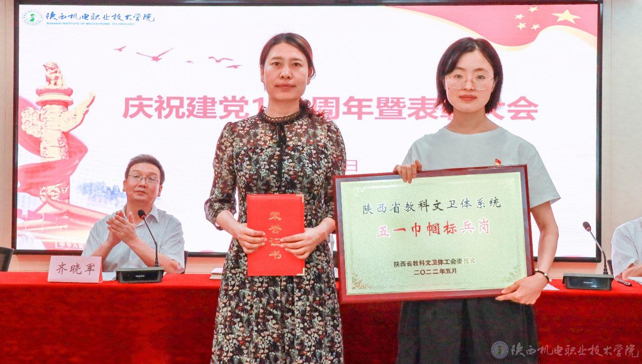 院長助理趙爭東宣讀陜西省教科文衛(wèi)體工會《關于表彰2022年陜西省教科文衛(wèi)體系統(tǒng)五一巾幗標兵和標兵崗的通報》并為五一巾幗標兵電子與信息學院副教授張瓊和五一巾幗標兵崗智能制造學院機電系頒獎。