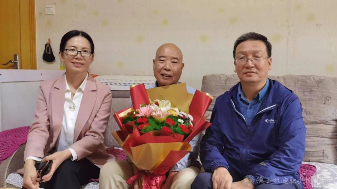 齊曉軍(右一)、張琴(左一)慰問(wèn)退休教職工李智權(quán)(左二)