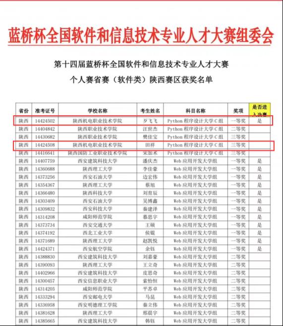 2023年4月8日,國家工業(yè)和信息化部舉辦的第十四屆藍橋杯陜西省省賽在寶雞文理學(xué)院舉行。陜西機電職業(yè)技術(shù)學(xué)院電子與信息學(xué)院厚溥IT軟件學(xué)院 嚴鑫 老師指導(dǎo)的 歹飛飛、田祥 同學(xué)分別獲省賽一等獎、三等獎的好成績,其中歹飛飛同學(xué)取得國賽參賽資格。