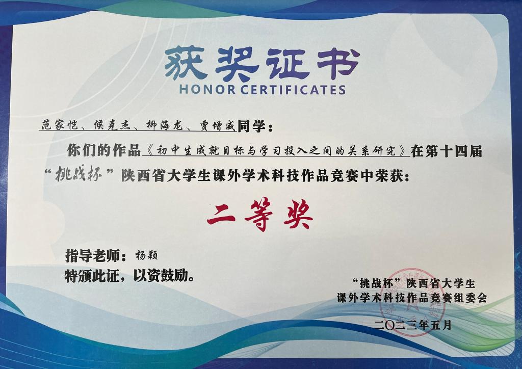 5月20日下午,第十四屆“挑戰(zhàn)杯”陜汽集團(tuán)陜西省大學(xué)生課外學(xué)術(shù)科技作品競賽在長安大學(xué)圓滿閉幕。我校參賽作品《初中生成就目標(biāo)與學(xué)習(xí)投入之間的關(guān)系研究》榮獲大賽“二等獎(jiǎng)”。