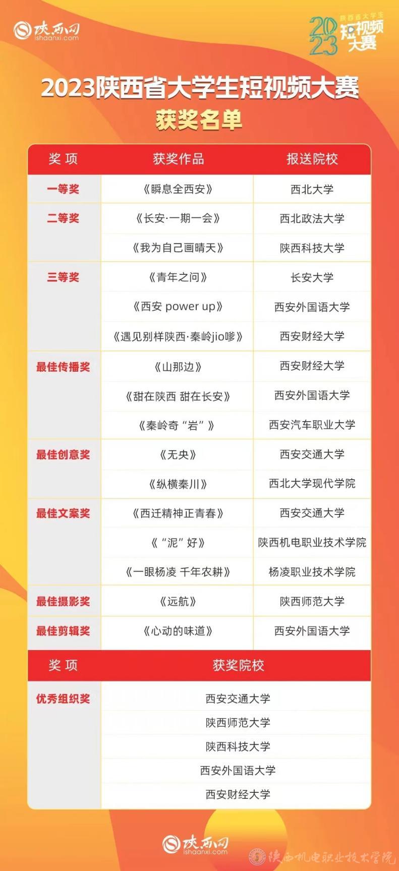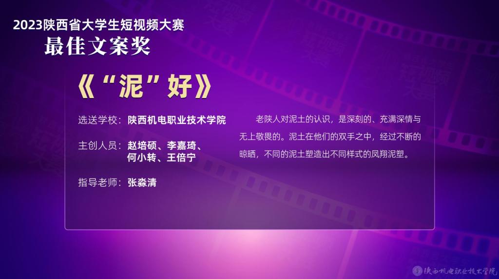近日,由陜西省委網(wǎng)信辦指導,西安市委網(wǎng)信辦、當代融媒體研究院主辦,陜西網(wǎng)承辦的2023陜西省大學生短視頻大賽頒獎典禮在西安交通大學興慶校區(qū)舉行。由我校鐵道工程學院張淼清老師指導,21軟件技術2趙培碩、22人工智能李嘉琦、22鐵道運管2何小轉(zhuǎn)、21網(wǎng)絡技術1王倍寧四位同學主創(chuàng)作品《“泥”好》榮獲最佳文案獎。