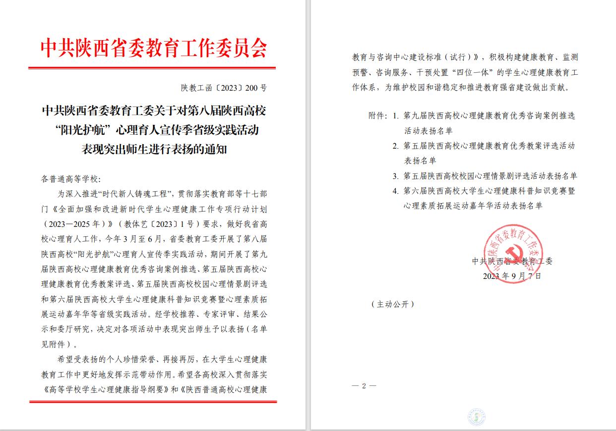 近日,由中共陜西省委教育工委組織開展的第八屆陜西高?!瓣柟庾o航”心理育人宣傳季省級實踐活動獲獎作品結(jié)果公布。我校共有三項獲獎,其中,二等獎2項,三等獎1項。