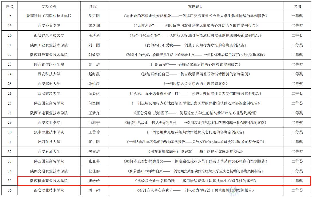 我校心理中心專職教師唐轉(zhuǎn)轉(zhuǎn)的參賽作品《比較是會偷走幸福的賊——運用情緒聚焦療法解決學(xué)生心理危機的案例》榮獲第九屆陜西高校心理健康教育優(yōu)秀咨詢案例二等獎;心理中心兼職教師張玉瓊的參賽作品《風(fēng)雨過后 方是彩虹——體驗壓力與挫折》榮獲第五屆陜西高校心理健康教育優(yōu)秀教案二等獎;心理中心專職教師張國華、唐轉(zhuǎn)轉(zhuǎn)指導(dǎo)的學(xué)生代表隊榮獲第六屆陜西高校大學(xué)生心理健康科普知識競賽暨心理素質(zhì)拓展運動嘉年華活動三等獎。