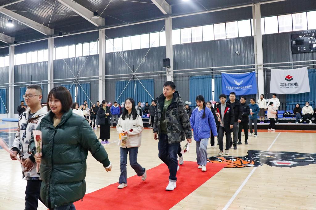 活動分為六個環(huán)節(jié)。室內(nèi)“破冰游戲”首先消除了男女青年職工之間的靦腆情緒,在主持人風趣幽默的引導下,現(xiàn)場氣氛變得越來越輕松活躍,大家全身心投入到一個個拓展活動項目中來?!靶挠星ЫY(jié)”“快樂鏈接”“齊心協(xié)力”等一個個有趣的項目在男女職工團結(jié)協(xié)作與默契配合下順利完成,短時間內(nèi)一句話、一個眼神、一個舉動,也許就是緣分開始?;顒舆€穿插了“黨的理論知識問答”環(huán)節(jié),答對題目者更有精美小禮品贈送。活動現(xiàn)場,大家敞開心扉、全情投入,在游戲中不斷加深印象、了解彼此、展現(xiàn)魅力。在最后的“送花表白”環(huán)節(jié)中,我校有4對教職工牽手成功,攜手打卡并互留了聯(lián)系方式,工作人員為每對牽手嘉賓頒發(fā)禮品,大家合影留念,定格美好記憶。