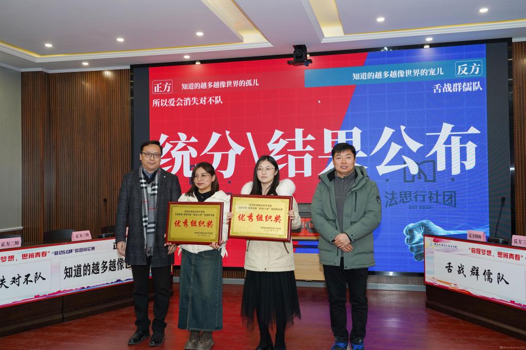 冠軍爭奪賽結(jié)束后舉行了頒獎儀式,與會領(lǐng)導(dǎo)為進(jìn)入決賽的8支優(yōu)秀參賽隊(duì)伍及其指導(dǎo)教師、最佳辯手頒發(fā)榮譽(yù)證書和獎品,為獲得優(yōu)秀組織獎的二級學(xué)院頒發(fā)獎牌。