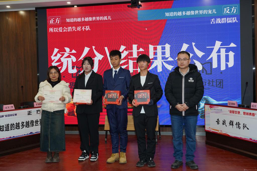 頒獎儀式結(jié)束后,更有參賽選手返場表演賽,給現(xiàn)場觀眾帶來一場別樣的辯論賽,引得現(xiàn)場陣陣喝彩和掌聲?!稗q以明思,明智啟智;論以博學(xué),博學(xué)弘毅?!鞭q論賽不僅是比賽,更是思想的碰撞,文字的交鋒。至此,本屆校園辯論賽圓滿落幕。
