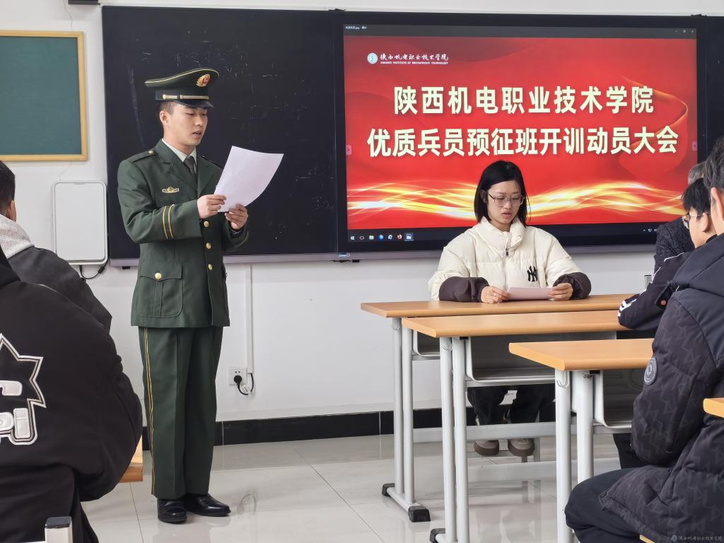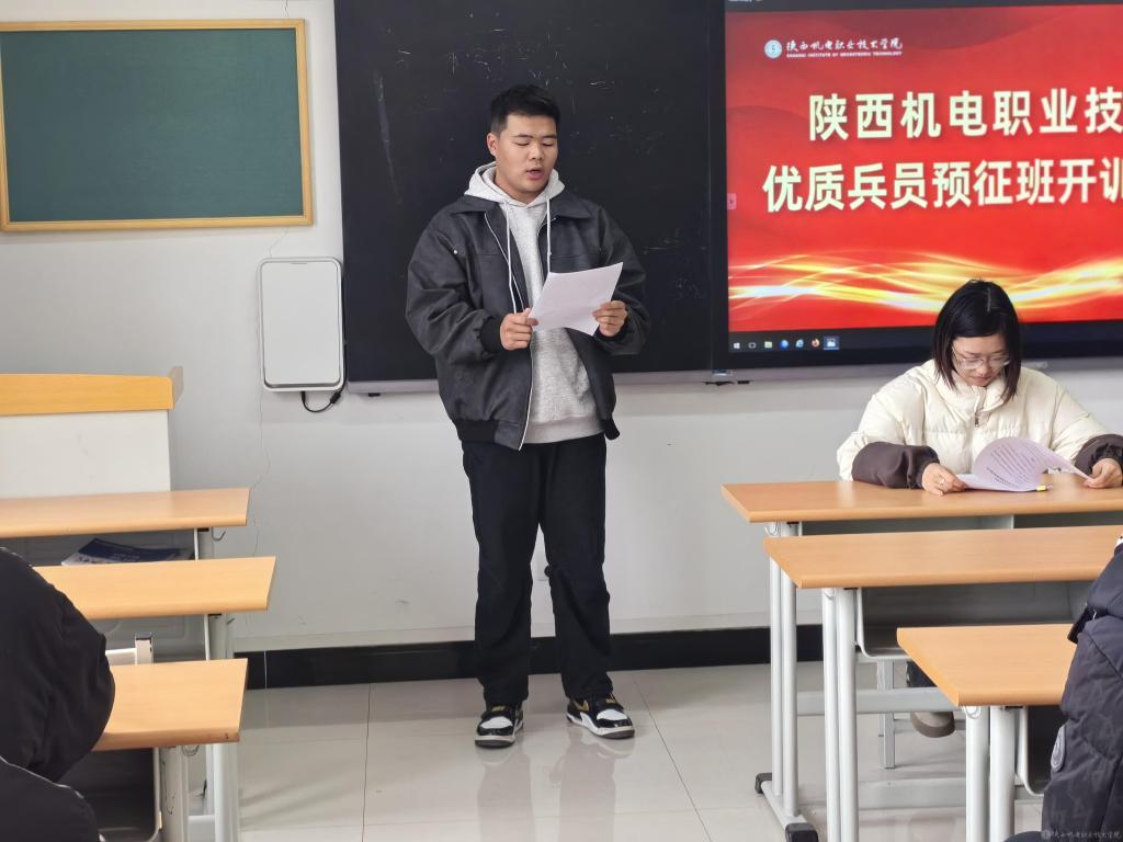人武部干事安童老師宣讀了《陜西機電職業(yè)技術(shù)學院優(yōu)質(zhì)兵員儲備基地預征班2024年度訓練計劃》,明確了訓練要求。預征班學員代表電子信息學院22現(xiàn)代信班屈楊帆、承訓退役士兵代表智能制造學院23機電技術(shù)1班李陽分別作了表態(tài)發(fā)言。