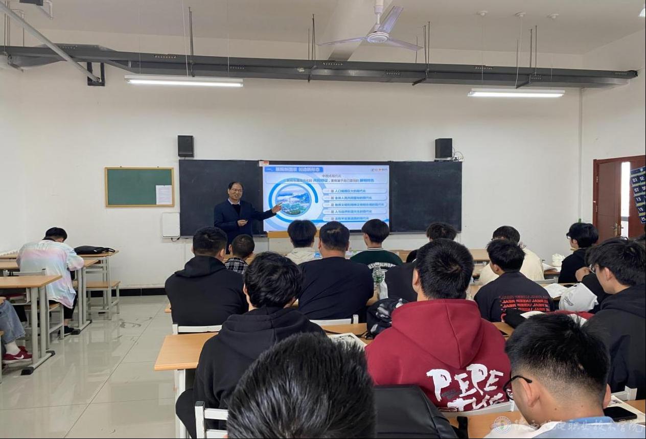 4月8日上午,陜西機電職業(yè)技術(shù)學(xué)院黨委書記伊遜智在博學(xué)樓317教室為22智能聯(lián)培1、22機械制造1合班學(xué)生上形勢與政策課,講授《讀懂中國式現(xiàn)代化》專題內(nèi)容。