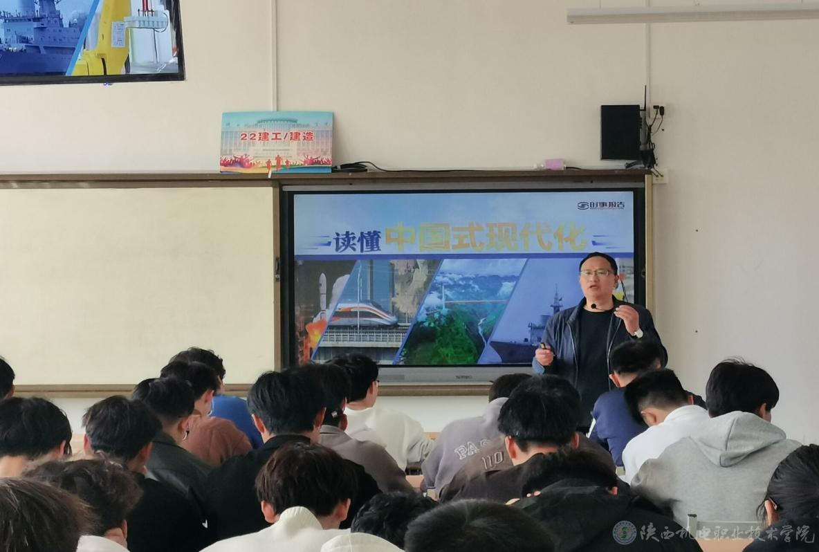 4月8日下午,陜西機(jī)電職業(yè)技術(shù)學(xué)院黨委副書記、院長向紀(jì)明在博學(xué)樓418教室為22鐵道工程專業(yè)學(xué)生上形勢與政策課,講授《讀懂中國式現(xiàn)代化》專題內(nèi)容。