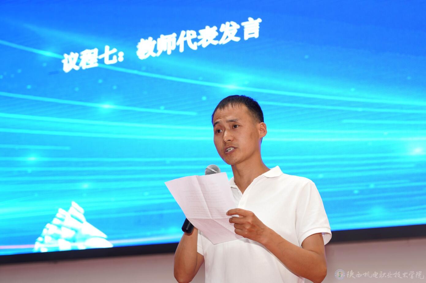 電子信息學(xué)院教師代表嚴(yán)軍峰老師發(fā)言,他希望同學(xué)們能夠“學(xué)一技之長立一生之本,以一技之長贏美好生活,用一技之長促建功立業(yè)”,并與同學(xué)們一起營造一技在手,一生無憂的良好社會(huì)氛圍。