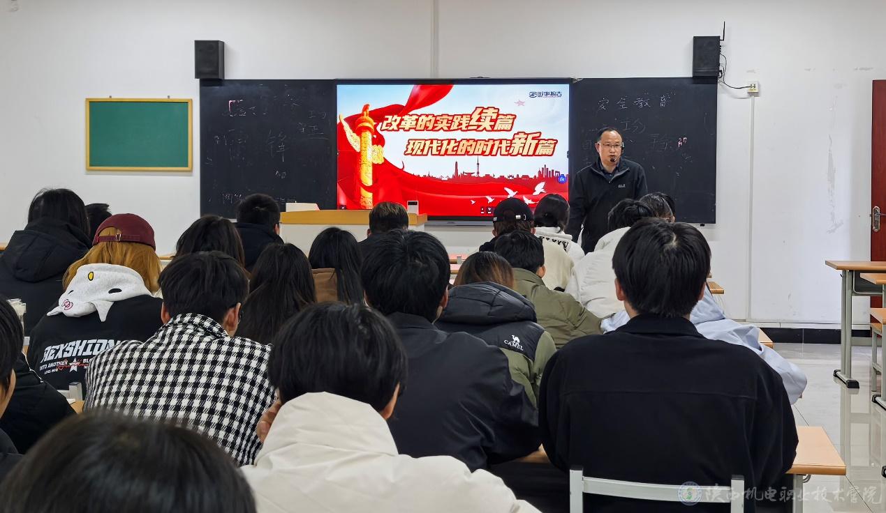 11月20日下午,陜西機(jī)電職業(yè)技術(shù)學(xué)院黨委副書(shū)記、院長(zhǎng)向紀(jì)明在博學(xué)樓112教室為23網(wǎng)絡(luò)技術(shù)1、2合班學(xué)生上形勢(shì)與政策課,講授《改革的實(shí)踐續(xù)篇 現(xiàn)代化的時(shí)代新篇》專題內(nèi)容。