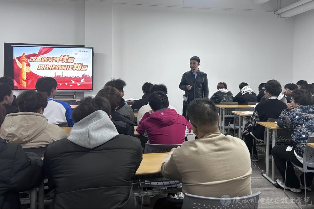 11月22日下午,陜西機(jī)電職業(yè)技術(shù)學(xué)院黨委委員、院長(zhǎng)助理趙爭(zhēng)東在行知樓西212教室為24機(jī)電技術(shù)7、8合班學(xué)生上形勢(shì)與政策課,講授《改革的實(shí)踐續(xù)篇 現(xiàn)代化的時(shí)代新篇》專題內(nèi)容。