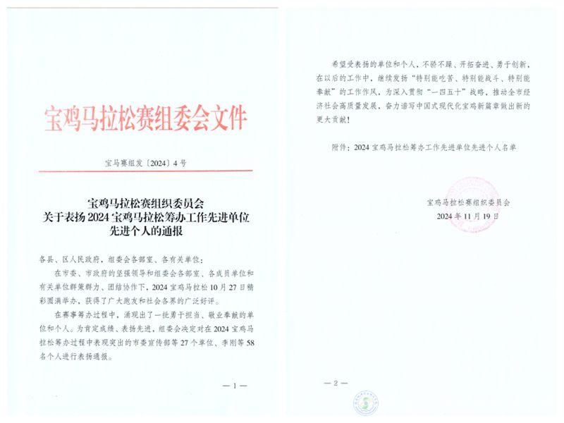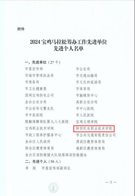 為確保馬拉松的順利舉行,近日,由寶雞市人民政府主辦,2024年寶雞馬拉松鳴槍開跑。陜西機電職業(yè)技術學院積極響應共青團寶雞市委的號召,積極宣傳、廣泛招募志愿者,經過層層選拔,最終遴選出750名志愿者為參加馬拉松、半程馬拉松、歡樂跑3項賽事的2.5萬余選手提供志愿服務工作。我校被授予2024寶雞馬拉松籌辦工作“先進集體”榮譽稱號;我校團委干事林妍君,青年志愿者服務中心學生干部雍小娥、王伯俊被授予“先進個人”榮譽稱號。