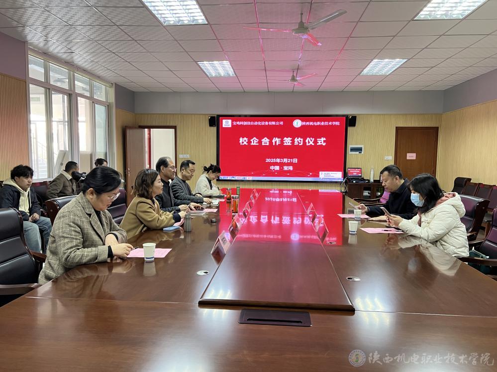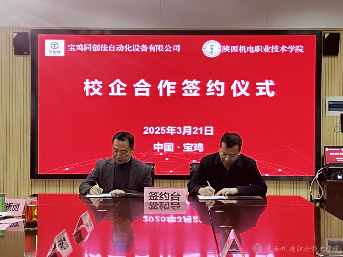 3月21日上午,陜西機電職業(yè)技術(shù)學(xué)院與寶雞同創(chuàng)佳自動化設(shè)備有限公司校企合作簽約儀式在學(xué)院圖書館二樓會議室隆重舉行。寶雞同創(chuàng)佳自動化設(shè)備有限公司總經(jīng)理劉朝龍、行政經(jīng)理呂艷妮,陜西機電職業(yè)技術(shù)學(xué)院黨委書記伊遜智,黨委委員、副院長張克出席簽約儀式。會議由校企合作處處長白娟娟主持。