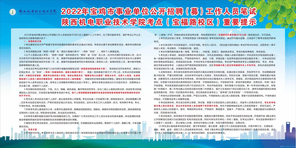 8.所有考生要積極配合做好考點的核酸檢測工作。為確保廣大考生和考試工作人員生命安全和身體健康,考試疫情防控措施會根據(jù)陜西省和寶雞市疫情防控總體部署和要求適時調整。