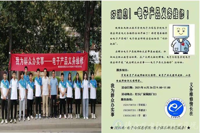 “學(xué)黨史、踐行動(dòng),解決群眾身邊的困難!”6月26日,在學(xué)校電子與信息學(xué)院支部書記高賦、教師景鵬斌和李鵬帶領(lǐng)和指導(dǎo)下,電子俱樂部師生在寶雞市燈頭廠小區(qū)門口為學(xué)校周邊群眾開展電子產(chǎn)品義務(wù)維修活動(dòng)。