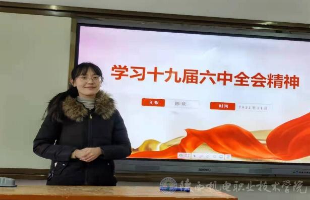 會議首先邀請馬克思主義學(xué)院陳歡老師為全體與會黨員做學(xué)習(xí)貫徹黨的十九屆六中全會精神專題報告。陳歡老師從黨的十九屆六中全會概況、公報內(nèi)容和《歷史決議》的創(chuàng)新與亮點等三個方面深刻解讀了黨的十九屆六中全會精神的豐富內(nèi)涵與核心要義,現(xiàn)場的同志們通過研學(xué)全會公報,從百年史詩中汲取智慧力量、品味精神甘露。