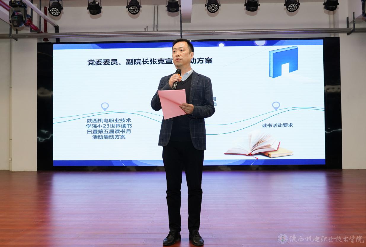 副院長(zhǎng)張克宣讀《陜西機(jī)電職業(yè)技術(shù)學(xué)院4·23世界讀書(shū)日暨第五屆讀書(shū)月活動(dòng)方案》