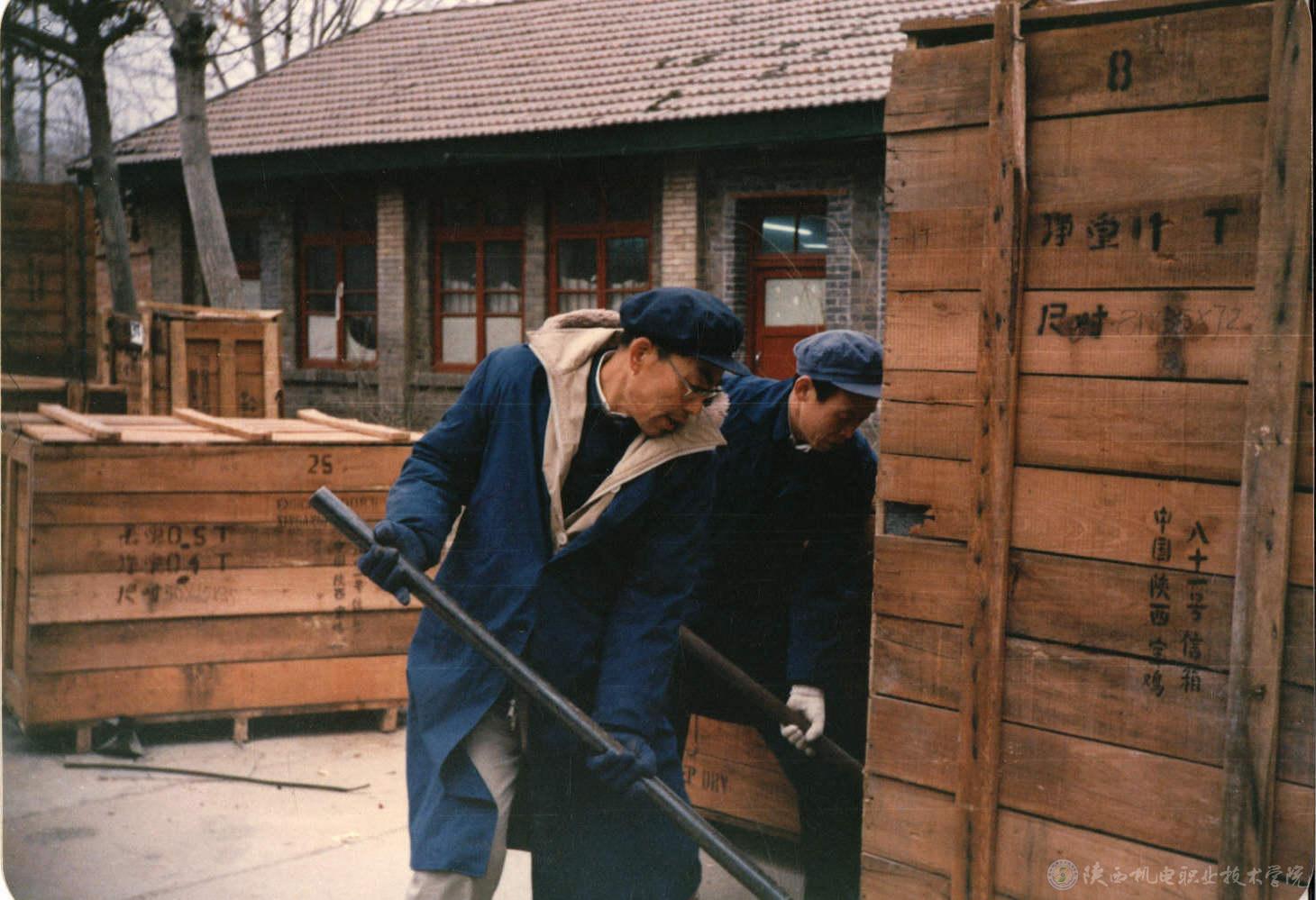 1988年12月5日 教工拆封設備 (后面平房是學校僅有辦公教學地點)