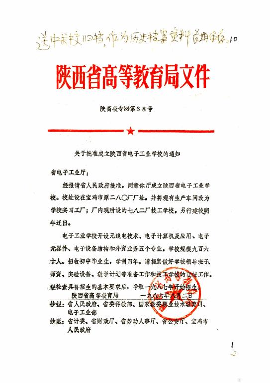 陜西省高教局發(fā)《關于批準成立陜西省電子工業(yè)學校的通知》(陜高教專[1986]第38號文)